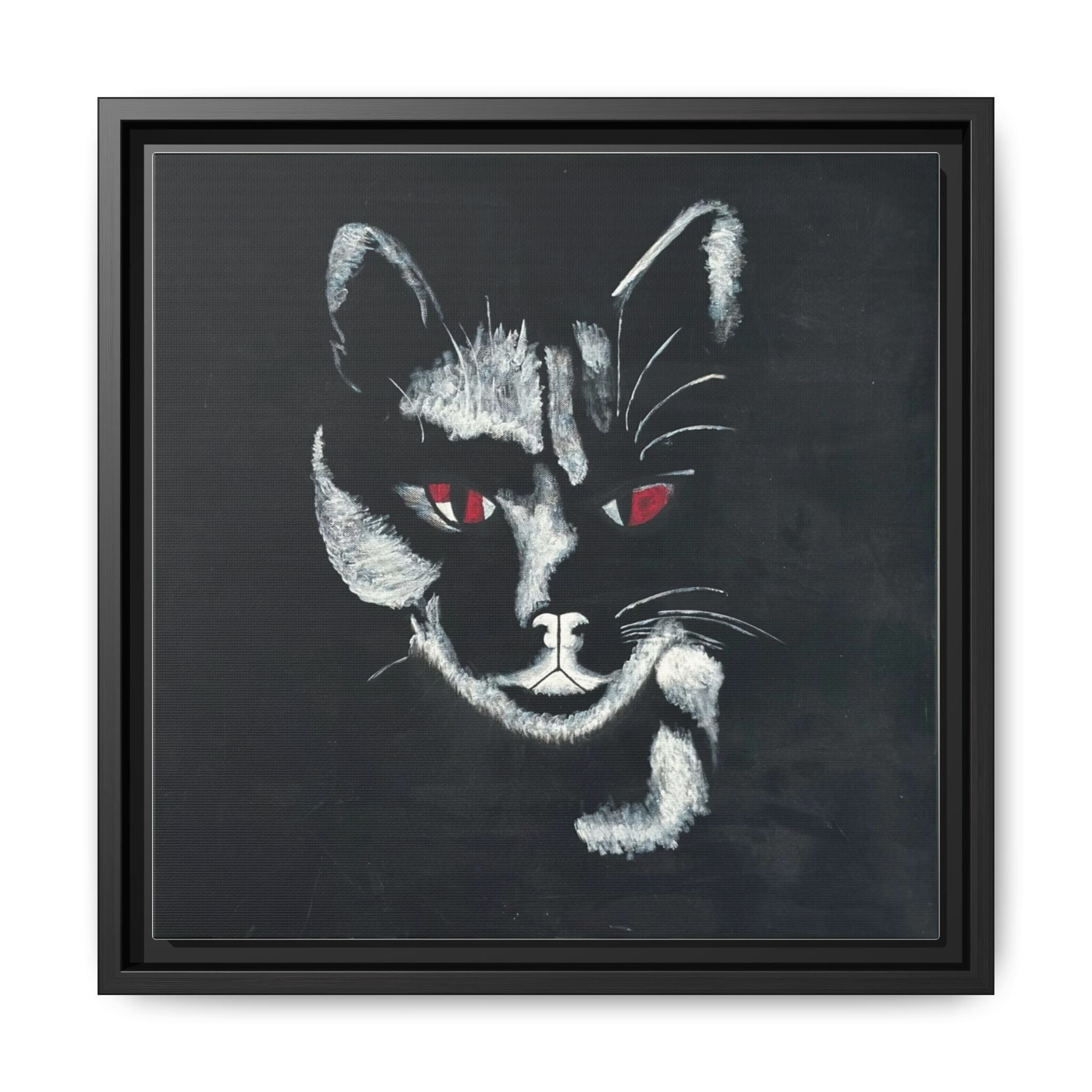 En katt skildrad i skuggor, med brinnande röda ögon som stirrar rakt in i själen. I kontrasten mellan mörker och ljus uppstår en känsla av mystik, som om varelsen vakar över något dolt. Den är både väktare och vägvisare, stilla men laddad med kraft.